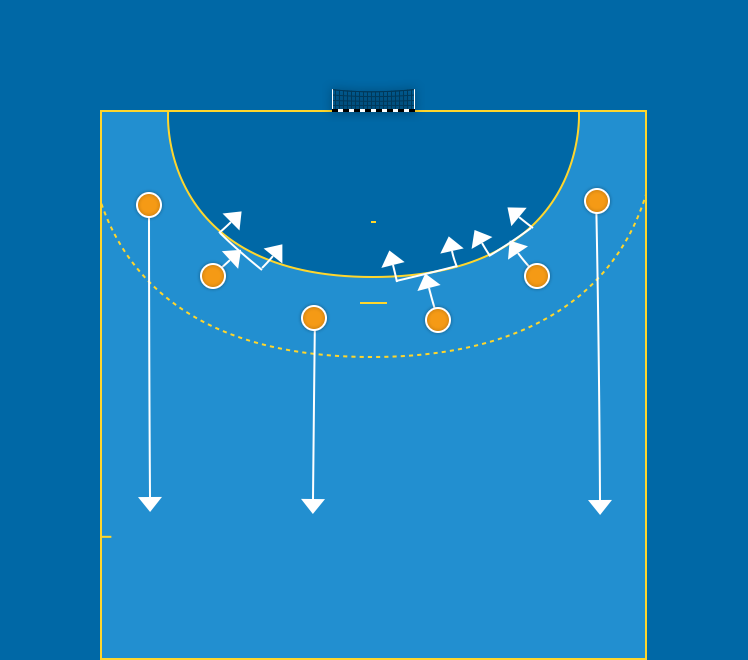 I ett 6-0-försvar har det traditionellt varit V1, H1 och en 3:a som startar fas 1-kontringen. Returen tas av V2, H2 och den andra 3:an.