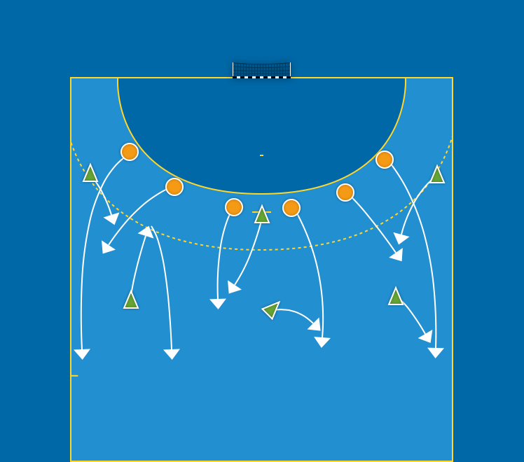 Vi utgår från att kontrande lag spelar svensk traditionell 3-3-kontring, det vill säga fas 1 av V1, H1 och en 3:a, fas 2 av V2, H3 och en 3:a.
