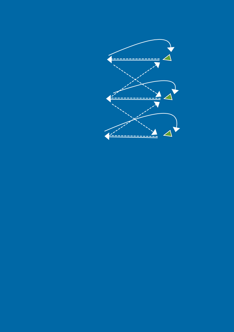 Tre niometersspelare, vänster, höger och mitten. Byte på signal mellan spelarna. Attackerande uppbackningar, bollen går: V9–M9–H9–M9–V9–M9 och så vidare. Efter satsningarna rör sig niometersspelarna bakåt cirka tre meter. Spelarna kan stå uppställda var som helst på banan.