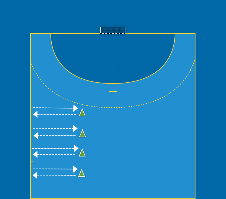 Spelarna tar tre steg eller står stilla med vänster/höger fot framme (beroende på om spelaren är höger- eller vänsterhänt) eller parallella ben och skjuter i väggen. Träna på: