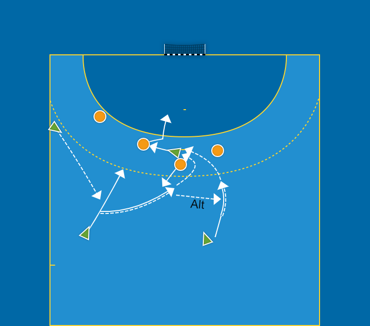 OBS! Linjespelaren roterar ett halvt varv i det att hen rör sig mot försvararen. Spärrar med motstöt med axel och skuldra i sidan på försvararen, tar därefter ett eller flera steg in tillbaka i luckan för att få inspel.