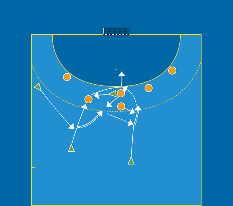 Axel- och skulderspärr, motstöt på nio meter mot 3–2–1-försvar