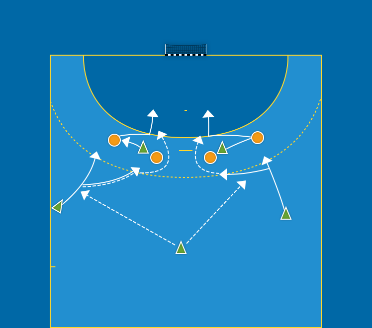 Axel- och skulderspärr med motstöt på sex meter, fyra försvarare i ett 6–0-försvar (mittblock). Sex anfallare varav två mitt spelare som växlar mellan varsin 2:a och 3:a. En M6 startar mellan H2 och H3 och den andre mellan V2 och V3. Starta med passivt försvar och öka aggressiviteten allteftersom.