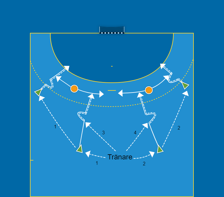 Två niometersspelare och två kantspelare (V6, V9, H9, H6) samt två försvarare arbetar i sidled och lite i djupled på varsin halva av sexmeterslinjen. Försvararen tar det försiktigt i början så att tekniken för anfallaren får automatiseras, därefter ökas försvarsintensiteten och genombrottens stoppas.