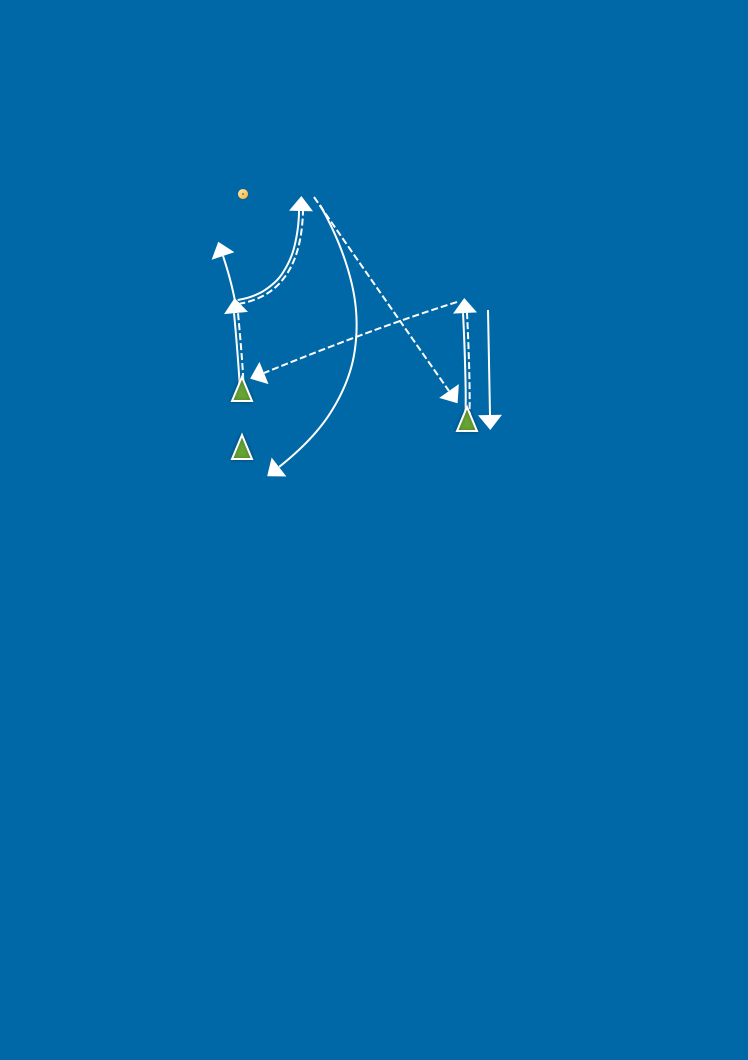 Stegisättningar, en boll, två spelare står framför en kon på tre–fem meters avstånd, en spelare står parallellt på sidan med boll. Spelaren passar den förste spelaren, som gör en stegisättning och passar tillbaka. Därefter passar hen och ställer sig bakom den andre, som startar och gör samma sak.