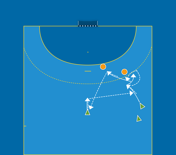 Öststatsfint. Samma uppställning som övning 3. TH9 backar efter öststatsfint och ställer sig bakom den andra H9:an. M9 satsar i djupled och backar upp H9:orna. Rullande övning. Passning efter öststatsfint.
