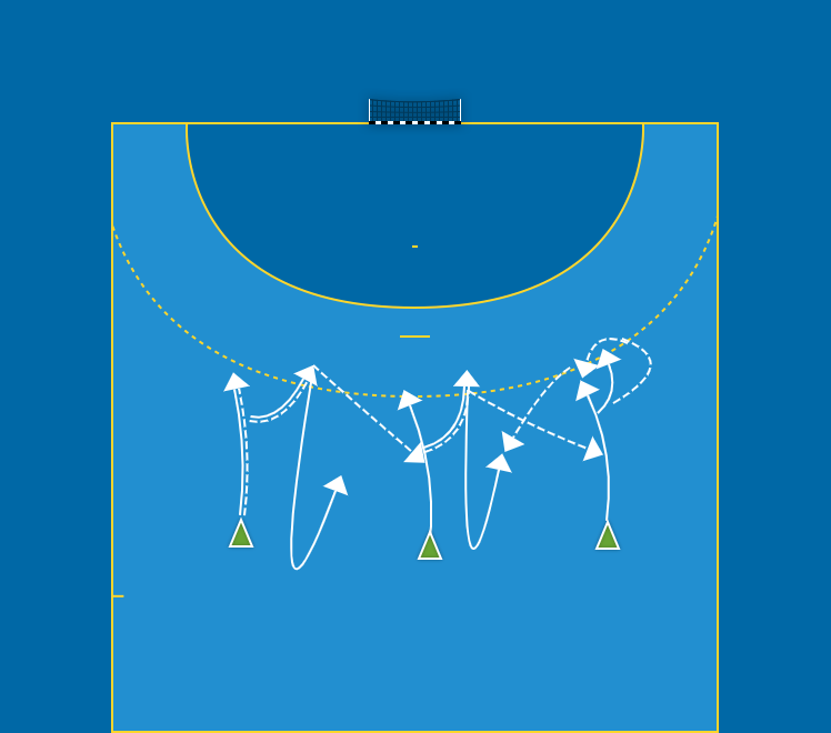 Rullande övning. En boll, tre niometersspelare (V9, M9, H9) och tre koner (eller övning utan koner). Alla 9:or har en kon tre–fem meter framför sig. Varje gång en 9:a får bollen gör hen antingen en stegisättning åt höger och passar, eller en öststatsfint åt vänster och passar. Spelarna backar för att få nytt djup. Platsbyte efter ett antal sekunder.