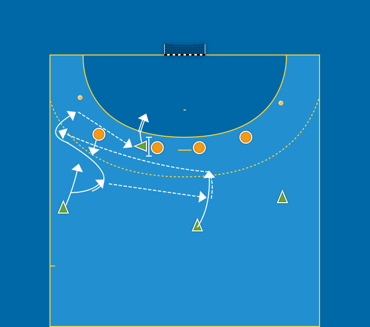 Rullning mot 6–0-försvar M6 i pos. 2 med bollvändning, personlig vändning och bred vändning övning 3