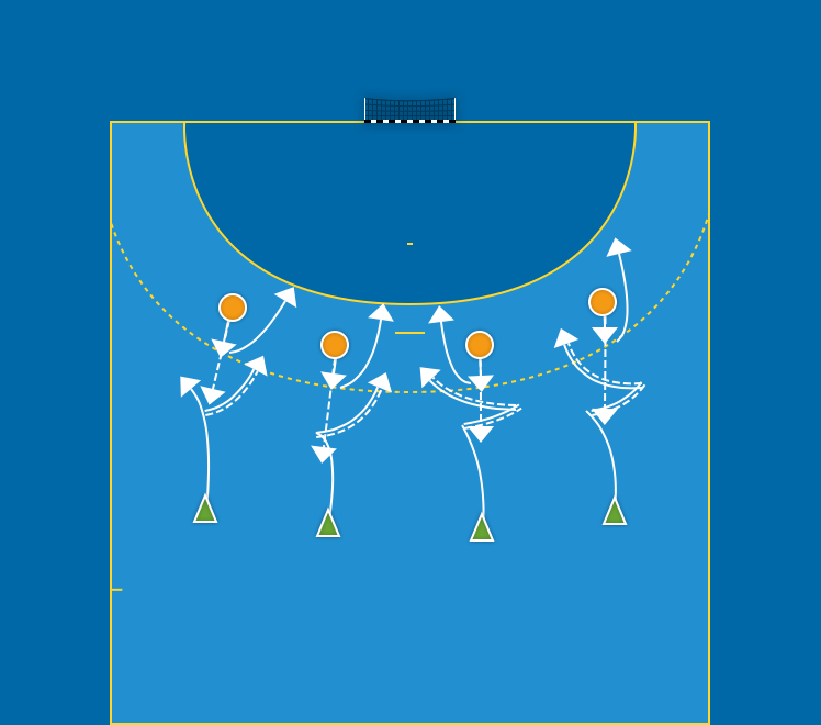 Solfjädersuppställning, en boll två spelare. Försvararen startar på ca: 7 m, går högt upp till 9m, och backar när anfallaren går på genombrott. Anfallaren passar försvararen som passar tillbaka bollen till anfallaren eller … Anfallaren kastar upp bollen till sig själv.