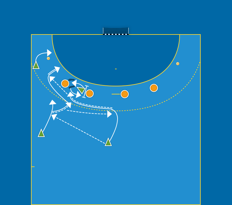 Rullning mot 6–0-försvar M6 i pos. 2 med bollvändning, personlig vändning och bred vändning övning 4