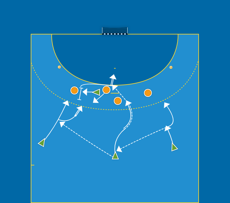 - Medrullning efter rysk spärr på offensiv 2:a. V9 spelar M9, M6 går på medrulle bakom CH som stöter på V9. M9 satsar mellan CF - VHB går på skott, inspel och vidarespel.