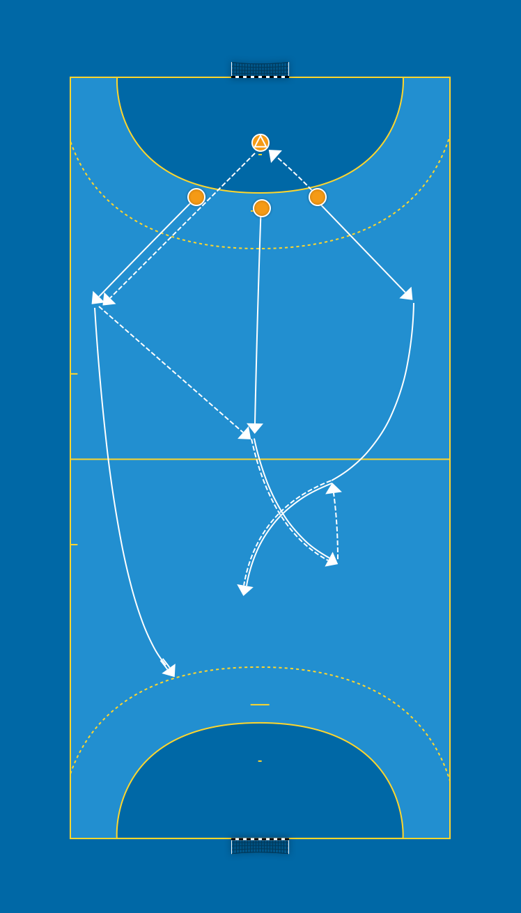 - Rullningsstart på Y9 – om bollen spelas ut till motsatt 2:a, exempelvis H2 spelar till M9 som spelar till V9 (tripp-trapp-trull) som startar rullning, M6 i pos. 2 eller 3 på startsidan.