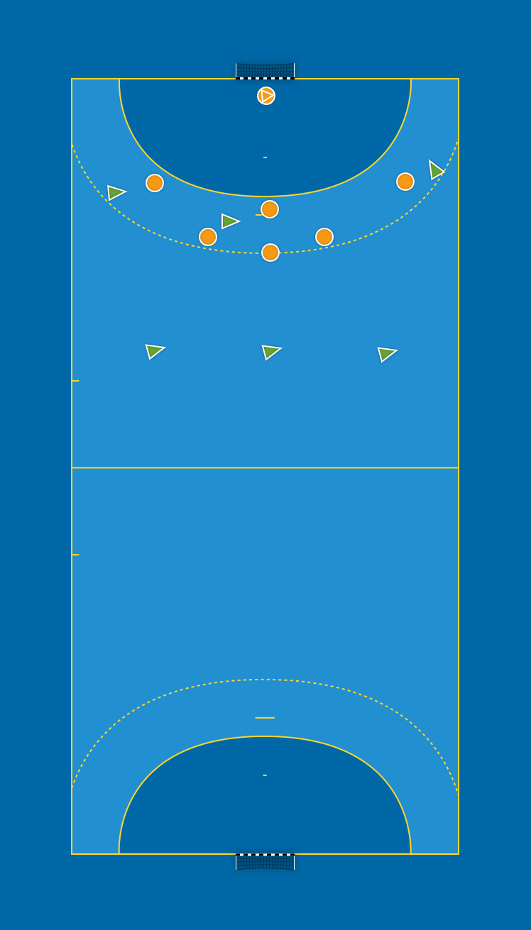 - Spela 6 mot 5eller när en anfallare ligger kvar i målgården eller kommer sent efter, M6 väljer en sida på 3:an, M9 väljer motsatt sida, spelar in eller rullar vidare.