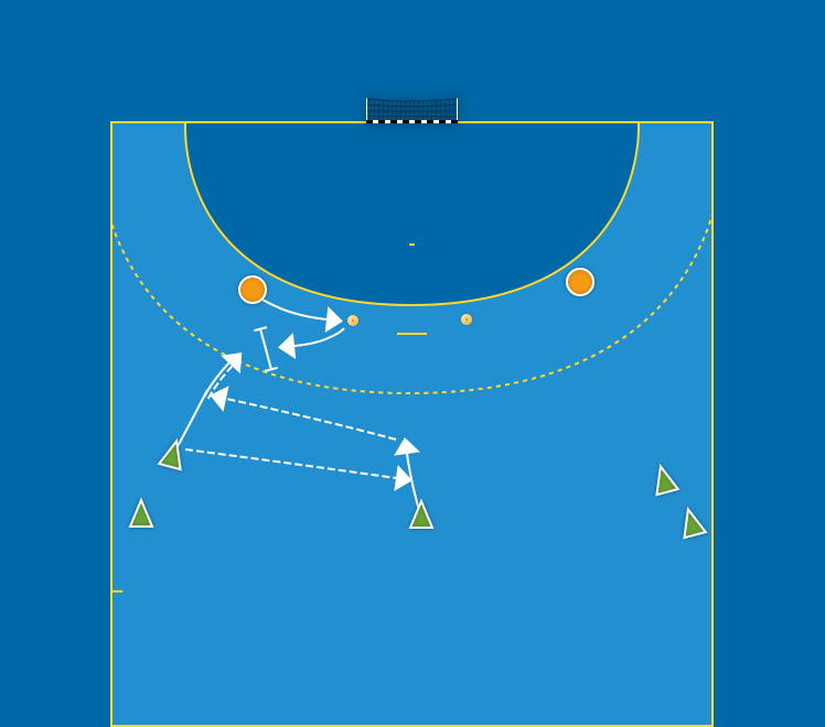 - Dubbla attacker, två Y9, där två efter varandra går på attack, antingen två skott eller genom- brott efter varandra, eller ett skott och ett genombrott. Tackla och lås om det går.