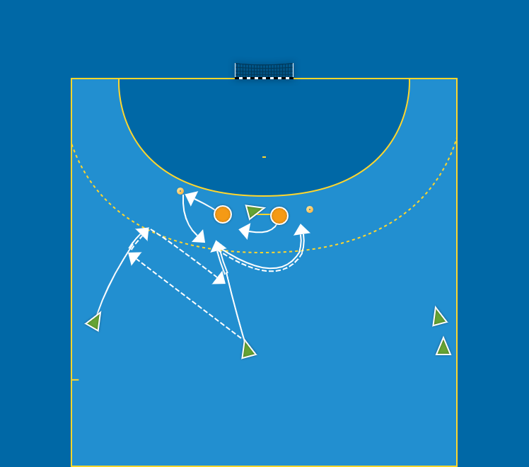 M9 spelar bollen till Y9, samtidigt säkrar 3:an ner och tar på konan. Y9 spelar till M9 som går på skott, genombrott eller inspel på ena 3:an och byter därefter zon. Nytt skott, genombrott eller inspelsförsök.