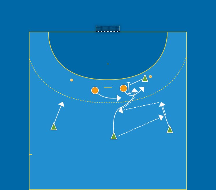 Fyra anfallare (V9, M9, H9 och M6), två försvarare. M6 utgångsposition är på utsidan av V3, M9 spelar bollen till H9, H9 tillbaka till M9, samtidigt spärrar M6 V3 utåt. M9 försöker utnyttja spärren.