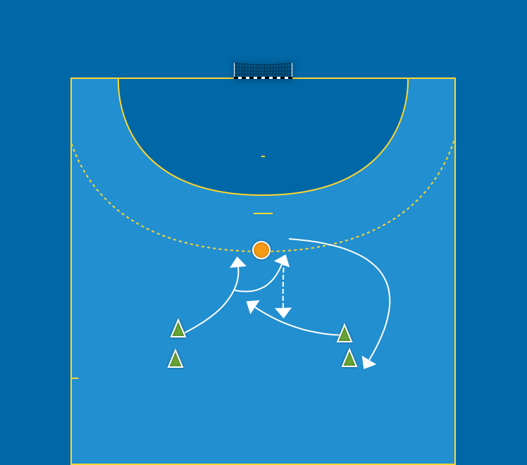 Rullande växlingar efter stegisättning och öststatsfint mot en passiv försvarare. Högerhänt spelare gör en hoppandes eller löpandes stegisättning och växlar (åt höger) till nästa spelare. Högerhänt spelare gör en öststatsfint, flyttar över bollen till vänster hand och växlar (åt vänster) till nästa spelare.