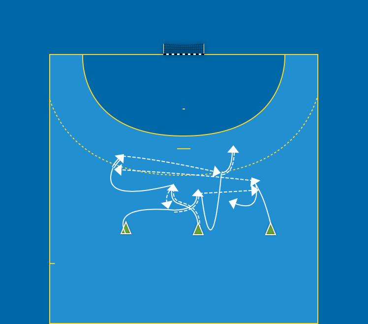 M9 växlar vänster (med rätt teknik) med V9 som går upp för hoppskott i zon 3. M9 faller ut som V9. M9 spelar H9, H9 satsar på mål och spelar över (överspel) till V9. V9 spelar den nya M9:an som växlar höger med H9 som går upp för hoppskott i zon 3 och så vidare.