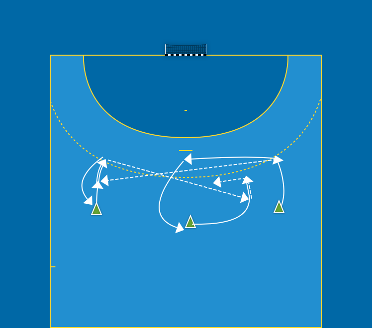 H9 skottsatsar med boll i zon 2 och spelar till V9 och går därefter på diagonal övergång. V9 skottsatsar i zon 2 samtidigt som M9 går i en båge ut som H9, V9 vänder bollen till H9. M9 bryter av diagonalövergången och kommer ut som M9. Ny skottsatsning av H9 med boll i zon 2 och spel till V9 och så vidare. Rulla från höger antal sekunder och byt därefter och kör från vänster.