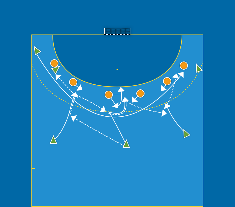 - M9 spelar bollen till Y9, samtidigt startar motsatt K6 på en lång kantinspringning (övergång) utan boll