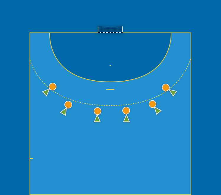 Sex anfallare – sex försvarare. Man-man-spel mot ett mål på halva planen.