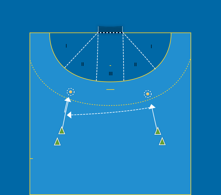 Samma som övning 1. Skottuppbackningar av niometersspelare i zon 2. Betona djupledsrörelse med och utan boll samt bredd och djup. Alternera mellan höger och vänster sida. Avsluta med grundskott eller hoppskott. Exempel på bollväg: H9–V9–avslut.