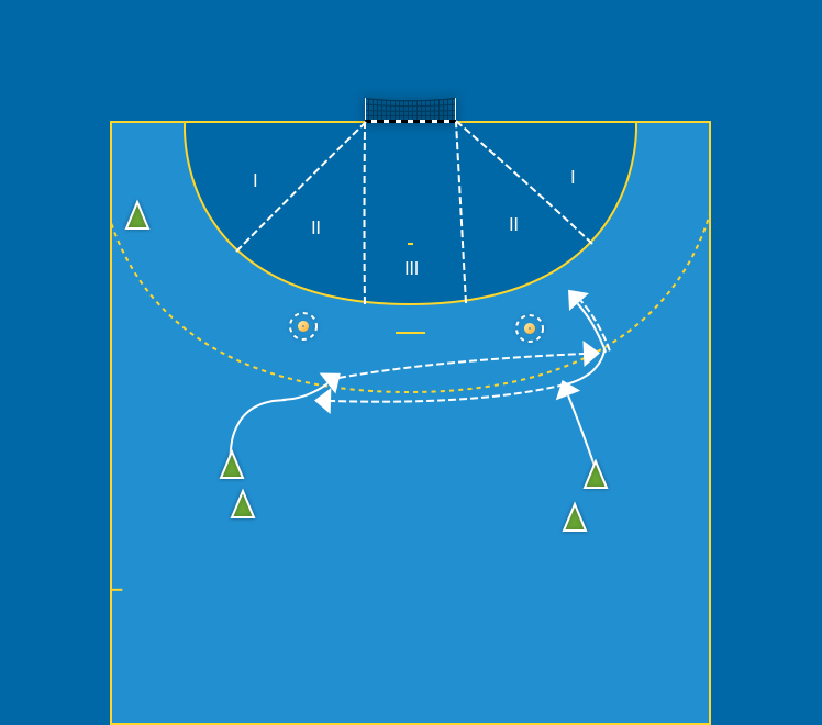 Samma som övning 3 men stegisättning med vändning, uppbackande niometersspelare backar ut och kommer brett för skott. Alternera mellan höger och vänster sida. Exempel på bollväg: H9-V9–H9–avslut.