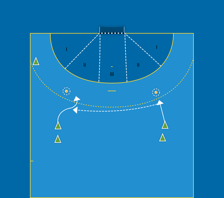 Riktningsändring av Y9:or innan spelaren får bollen, skott. Skottuppbackningar från motsatt 9:a. Om det är en högerhänt H9: hoppskottssatsning och vändning i luften. Alternera mellan höger och vänster sida. Exempel på bollväg: H9–V9–avslut.