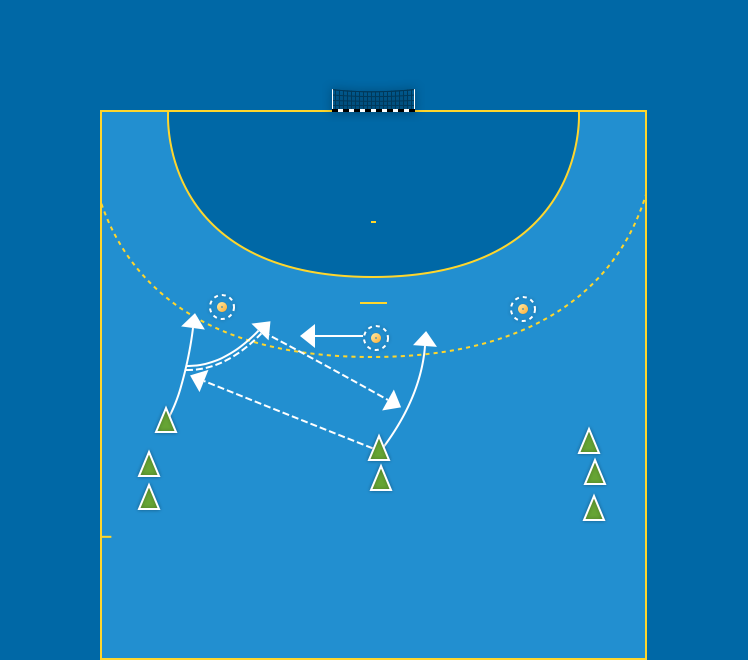 Samma som övning 3, passningsstart från M9. Y9 väljer skott eller genombrott (beroende på försvararens agerande). Väljer Y9 att gå inåt är ”stegisättning” ett bra alternativ. Y9 kommer i ett så kallat slagläge där spelaren kan välja skott eller vidare spel samtidigt som spelaren drar på sig nästa försvarare. Övertag skapas. M9 söker luckan parallellt och avslutar. Alternera mellan vänster och höger sida. Exempel på bollväg: M9–V9–M9–avslut.
