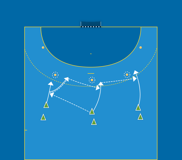 Samma som övning 4 men M9 avslutar eller rullar vidare till Y9 som avslutar. OBS! Y9 har rätt att gå utåt i första satsningen, för att inte trycka ihop försvaret. Alternera mellan vänster och höger sida. Exempel på bollväg: M9–V9–M9–H9–avslut.