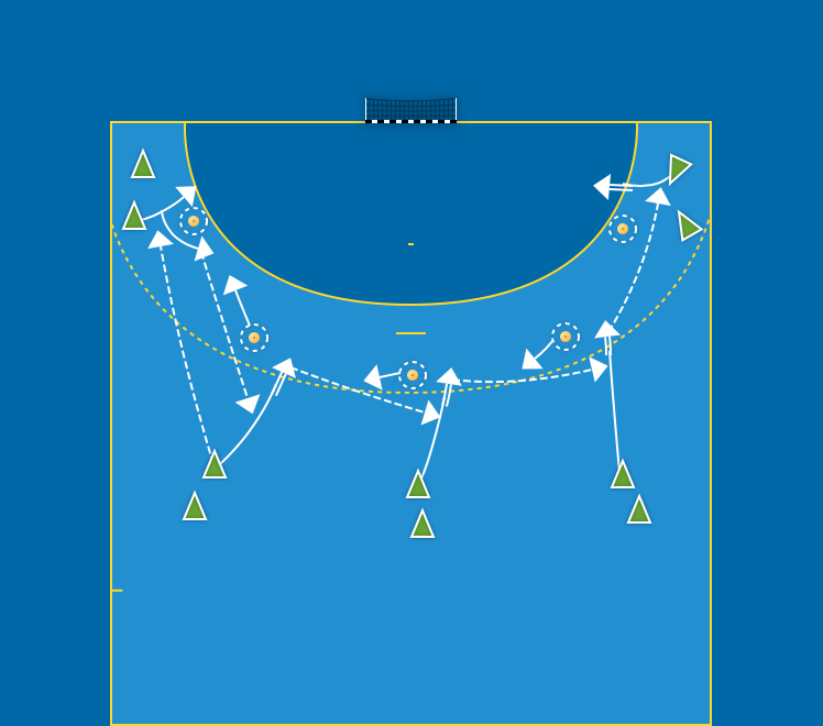 K6 startar satsning med enkelfinter, dubbelfinter och så vidare i zon. Om V6 är högerhänt och väljer att gå inåt, är ”stegisättning” ett bra alternativ. V6 kommer i ”slagläge” och kan både skjuta och spela vidare samtidigt som spelaren drar på sig nästa försvarare. Övertag skapas. Y9 söker luckan parallellt och avslutar eller spelar vidare. M9 söker också luckan parallellt, likaså gör motsatt Y9. Alternera mellan vänster och höger sida. Exempel på bollväg : V9–V6–V9–M9–H9–H6–avslut.