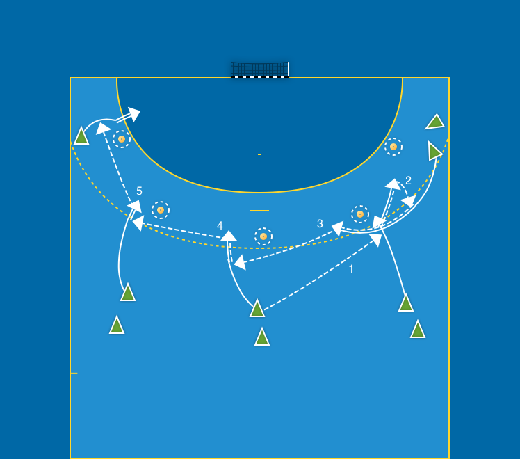 Om laget inte har en vänsterhänt H9 utan bara en vänsterhänt H6 kan rullning starta med en stegisättning av H9. H9 ”trycker”, drar med sig 2:an, så att H6 kommer runt för skott eller genombrott eller vidare spel om 3:an tar H6. Passningsstart från M9. Alternera mellan höger och vänster sida. Exempel på bollväg : M9–H9–H6–M9–V9–V6–avslut.