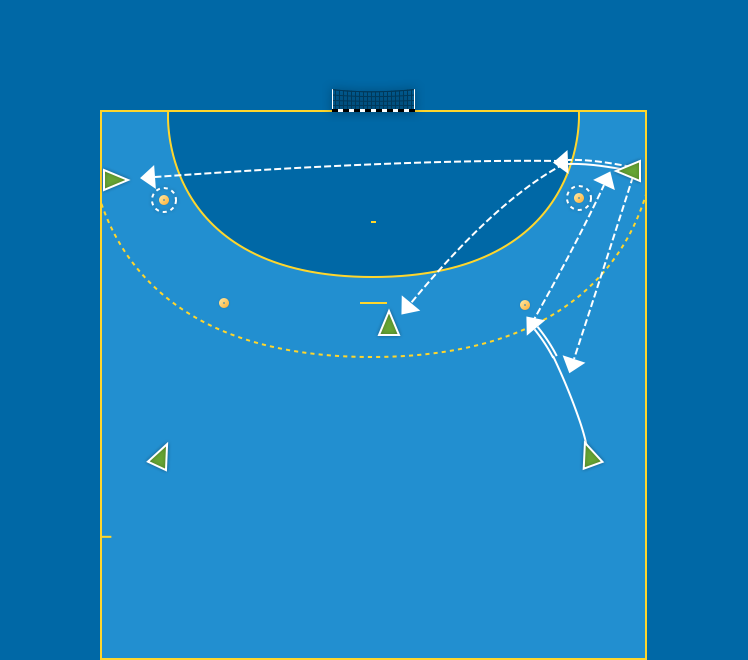 Kantskott efter direktutspel. H6 spelar bollen till H9, H9 skottsatsar på insidan eller utsidan 2:an och vänder tillbaka till H6. H6 kan välja mellan eget avslut, passning till M6 eller till motsatt K6. Alternera mellan höger och vänster sida.