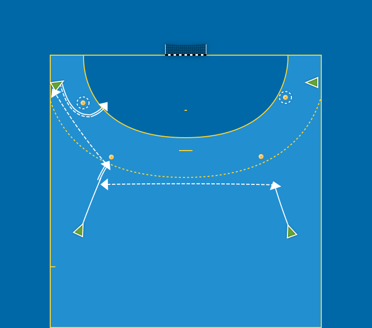 Kantskott efter genombrott. H9 spelar bollen till V9, V9 skottsatsar på insidan eller utsidan 2:an, eller direkt utspel framför 2:an till V6:an, som går på genombrott (enkelfint, dubbelfint, vändningar m.m.). Alternera mellan höger och vänster sida.