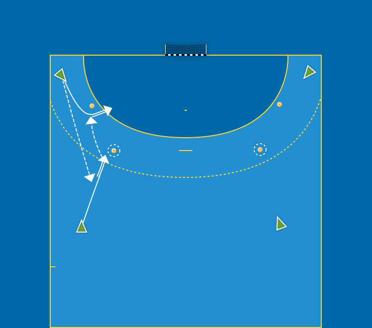 Kort kantinspringning utan boll. V6 backar upp V9 som skottsatsar. Samtidigt som V9 slår passning startar H6 kort inspringning mellan 1 och 2, avslut. Alternera mellan höger och vänster sida.