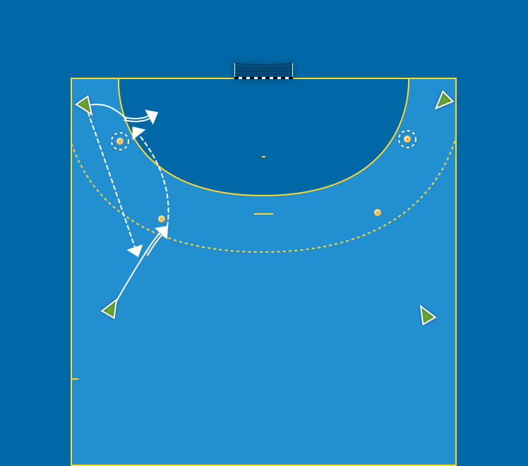Luftpass. V6 backar upp V9 som skottsatsar. Samtidigt förflyttar sig V6 längre ut på kanten. När V9 slår luftpassning hoppar V6 in i målgården, V6 fångar bollen i luften och avslutar. Alternera mellan höger och vänster sida.