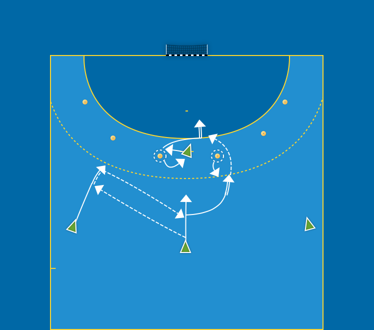 Axel-/skulderspärr med motstöt och medrullning mellan 3:orna. V9 skottsatsar på 2:an. V9 spelar M9 som går på stegisättning förbi H3 in mot V3, samtidigt slår M6 en axel-/skulderspärr med motstöt på H3. M6 kommer därefter tillbaka (medrullning) och får insticket (inspel) från M9, som också kan avsluta. Alternera mellan höger och vänster sida.
