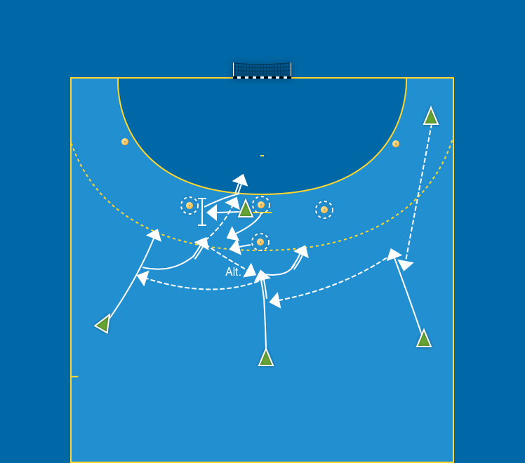 Rysk spärr på halvbackarna (mot 3-2-1-försvar). Bollen går H6–H9–M9–V9 som utmanar med en stegisättning på HHB. M6 slår rysk spärr på HHB, V9 avslutar, spelar in till M6 som faller ner eller spelar vidare till M9. V9 bör försöka dra på sig CH. Kan genomföras med två M6:or: den ena slår spärr, den andra vilar på kortlinjen. Alternera mellan höger och vänster sida.