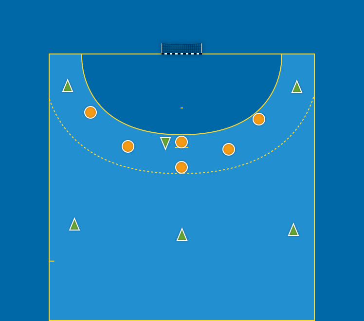 Tillämpningsövning 6 mot 6 i ett 6-0- och 3-2-1-försvar. Testa uppbackningsspel, rullningsspel och K6:ans spel (mot 6-0- och 3-2-1-försvar). Integrera M6:ans spel. M9 (eller någon annan) styr upp spelet med olika starter.