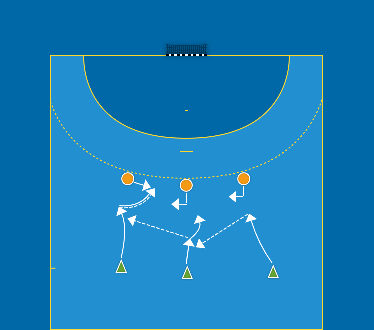 Samma som i övning 2 men nu spelar niometersspelarna tillsammans, går på skott eller genombrott och kan även växla eller byta positioner. Niometersspelarna bör inte gå på övergång. HF, MF och VF arbetar tillsammans enligt tidigare beskrivna principer (de tre ö:na): överlämna/överta/överblick.