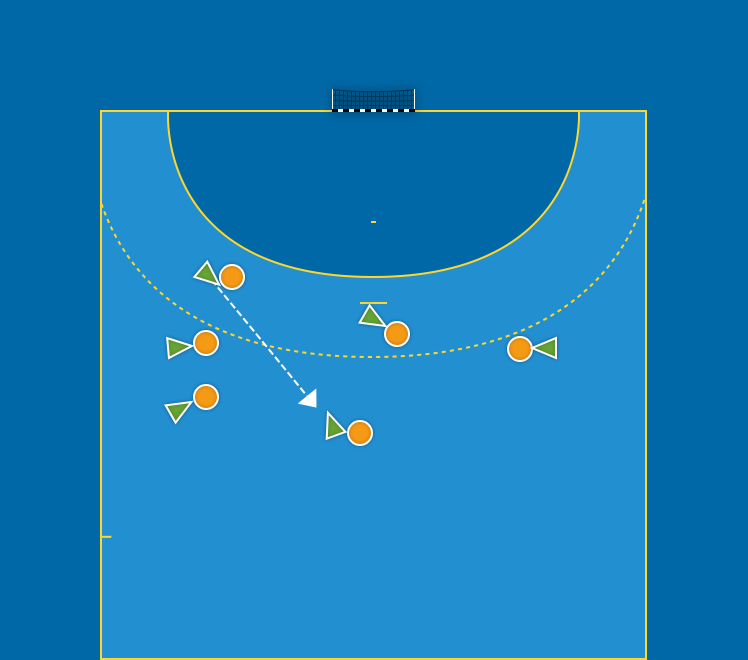 Räkneboll. Två lag. Man-man-träning för grundtekniken. Bryter försvarande lag startar de med ny räkning.