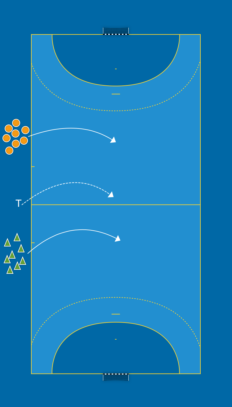 Träning för att snabbt ställa om från anfall till försvar. Tränaren står uppställd med två lag utanför planen vid mittlinjen. Tränaren kastar ut bollen mot mitten och ropar ut det antal spelare ur de båda lagen som deltar på varje ny boll. Avsluta med skott på mål. Det gäller att snabbt söka sin spelare och position då försvar uppstår. Kom överens innan vilken spelare som ska tas.