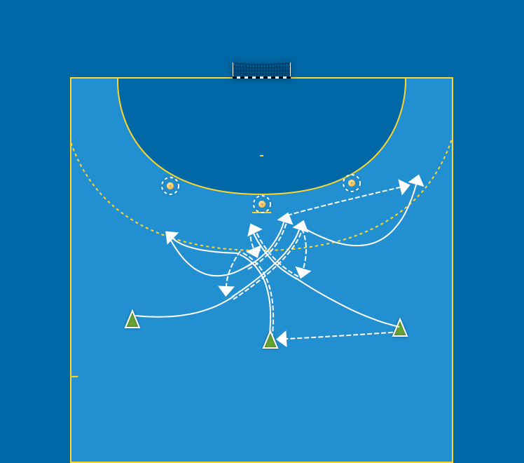 Y9 spelar M9. M9 går på skott och växlar upp Y9 som går på avslut och växlar upp den andra 9:an. M9 faller ut som Y9, den uppväxlande Y9:an går på skott eller spelar vidare till motsatt Y9 som kommer brett på avslut, skott, genombrott eller utspel.
