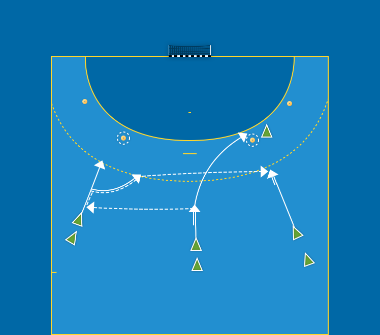 M9 skottsatsar och vänder upp bollen till V9. M9 går därefter ner på mittövergång på utsidan V2. V9 skottsatsar och vänder bollen till H9. H9 attackerar 2:an, avslutar med skott eller inspel. Alternera mellan höger och vänster sida.