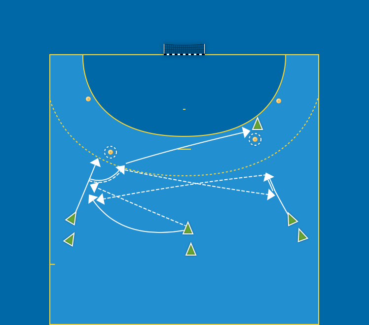 Diagonalövergång. V9 skottsatsar och vänder bollen till H9. H9 skottsatsar samtidigt som V9 springer in diagonalt mot vänsterförsvaret. M9 parallellförflyttar ut mot V9:ans position och blir uppbackad av H9. Avslutar med skott eller genombrott. Alternera mellan höger och vänster sida.