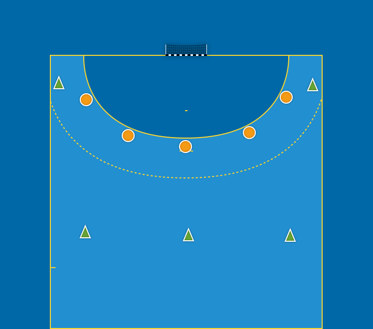 Tillämpningsövning 5 mot 5 (6-0-försvar). Betona övningarna 1–3.