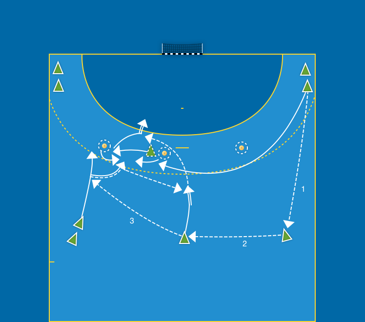 Samma som övning 1 men med axel-/skulderspärr med motstöt på 2:an inåt i samarbete med Y9. Som alternativ kan Y9 spela M9 som spelar in K6 eller skjuter. K6 kommer på medrulle. Alternera mellan höger och vänster sida.