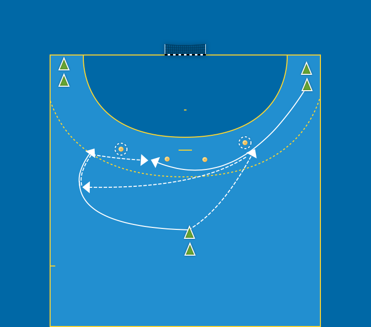 Isärdragning för K6. Lång inspringning med och utan boll över zonen. K6 startar utan boll, M9 spelar K6 och flyttar parallellt med K6. K6 spelar bollen tillbaka till M9 som går brett och spelar tillbaka till K6 som avslutar. Alternera mellan höger och vänster sida.