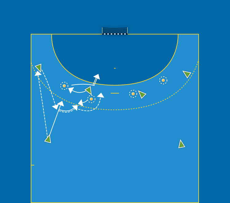 M6 i position 2. Korta AB-lock mellan 2:an och 3:an mot offensiv H3. V9 spelar V6 som attackerar, V6 spelar V9 som gör en satsning från H2 till H3. H3 stöter upp. Samtidigt slår M6 en kort AB-lock genom att rotera ett halvt varv med ryggen mot H2 (utan kroppskontakt). M6 faller därefter ner bakom H3, V9 spelar in (exempelvis insticket). Alternera mellan höger och vänster sida.