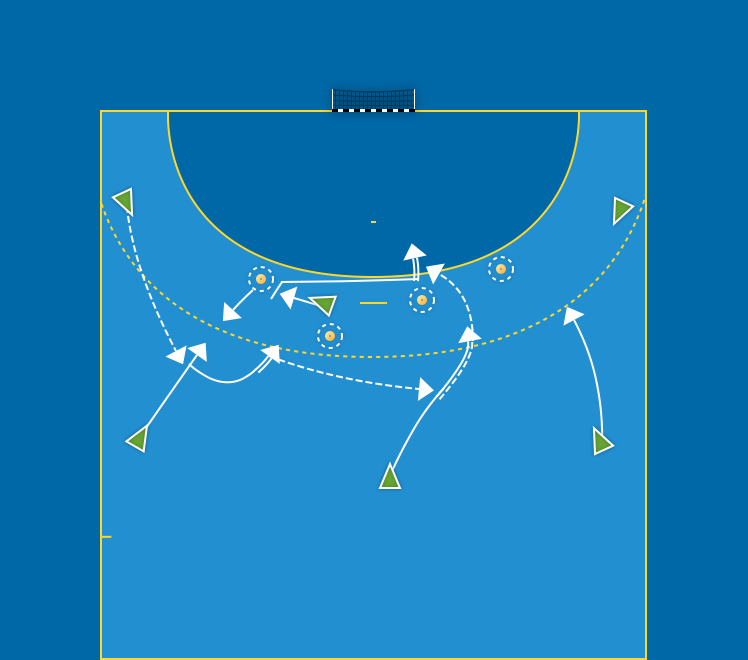 M6 i position 2. Kort AB-lock med rullning, V6 spelar V9 som satsar på en stegisättning mot H2 inåt. Samtidigt går M6 på en kort AB-lock från H3 till H2. V9 spelar M9 som söker luckan mellan V3 och V2. Efter kort AB-lock kommer M6 löpandes bakom H3 och får inspel från M9. Om bollen spelas till H9 kan inspel även komma därifrån. Alternera mellan höger och vänster sida.